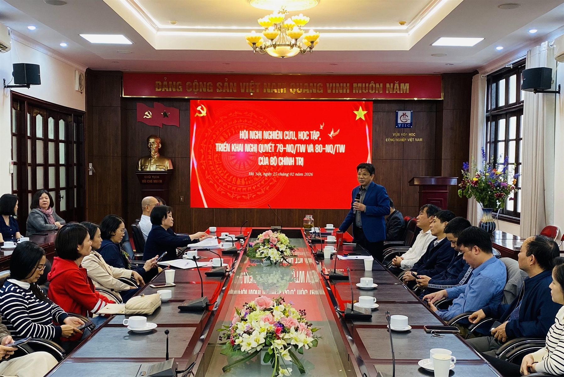 Thực hiện Thông báo số 150-TB/ĐU ngày 24/02/2026 của Ban Thường vụ Đảng ủy Tập đoàn Hóa chất Việt Nam, Đảng ủy Viện Hóa học Công nghiệp Việt Nam đã tổ chức và triệu tập toàn thể các đồng chí đảng viên trong Đảng bộ Viện tham dự Hội nghị nghiên cứu, học tập, quán triệt và triển khai thực hiện Nghị quyết số 79-NQ/TW về phát triển kinh tế nhà nước và Nghị quyết số 80-NQ/TW về phát triển văn hóa Việt Nam theo hình thức trực tuyến.